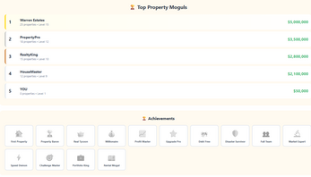 Start with $50,000 and turn it into a real estate empire! Buy undervalued properties, upgrade them, collect rental income, and sell for massive profits. Navigate market events, survive disasters, and climb the leaderboard to become the ultimate property mogul!